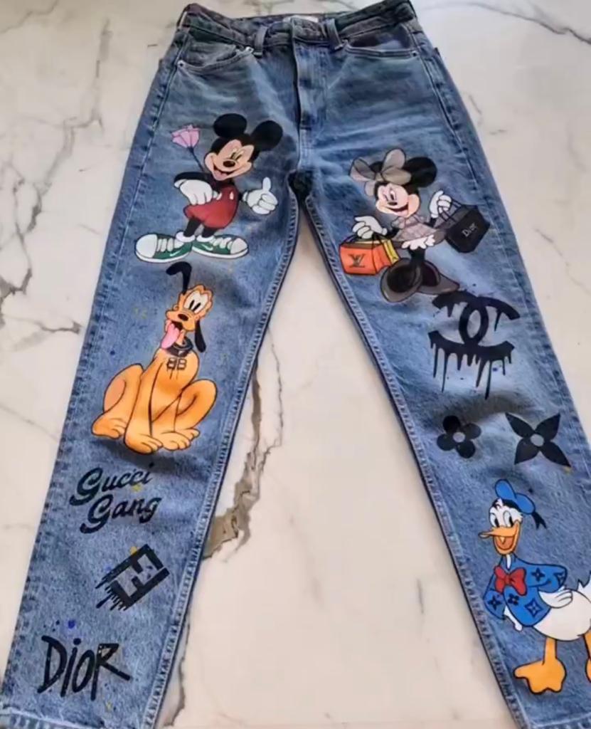 Give a new look to your jeans, trousers and shorts by getting it handpainted. Send us your old or new jeans, trousers and shorts and we will hand paint it with your desired image. This Jeans is dedicated to the Disney World. You can get any image handpainted–be your name, initials, your portrait or your pet’s. The price below is for handpainting only. Details in Description.